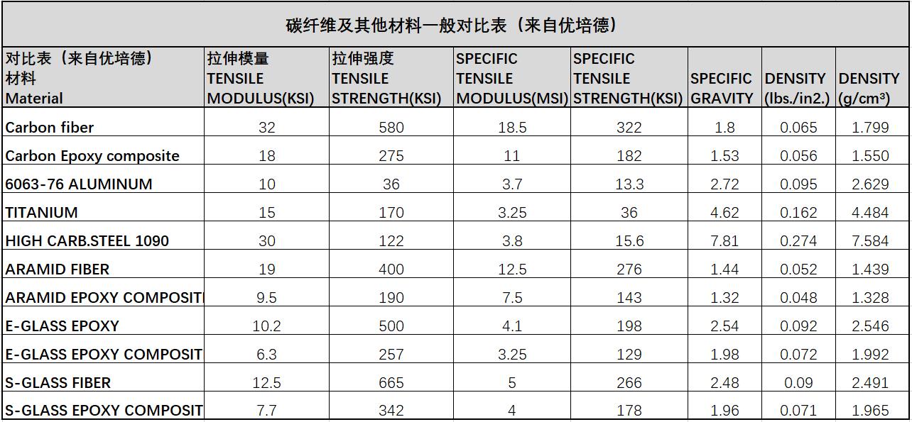 碳纖維管材的強(qiáng)度和剛度很難直接與金屬管材直接對(duì)比,因?yàn)樘祭w維材料鋪層過(guò)程中纖維取向有很多可能性,而復(fù)合管的強(qiáng)度、剛度和重量由纖維模量、纖維方向/放置和所使用的樹(shù)脂系統(tǒng)決定。但是對(duì)于金屬管材,其性能僅由管材本身的材料規(guī)格和尺寸決定,不涉及方向性因素。這實(shí)際上是也是碳纖維管相對(duì)于金屬管的一大優(yōu)勢(shì)。上表中我們已經(jīng)分解了圖表,展示的有纖維本身以及環(huán)氧樹(shù)脂與纖維基體的屬性,這確實(shí)也顯示出樹(shù)脂/纖維比例的重要性,因?yàn)樘嗟臉?shù)脂確實(shí)會(huì)削弱管結(jié)構(gòu)。我們的管材的樹(shù)脂/纖維比例經(jīng)過(guò)多年驗(yàn)證是比較優(yōu)的。上表的具體性能參數(shù)對(duì)比只是基于一般屬性范圍,不應(yīng)用于具體的產(chǎn)品設(shè)計(jì)目的。我們需要根據(jù)給定的技術(shù)要求具體設(shè)計(jì)其鋪層和選材包括生產(chǎn)工藝,因此如果有具體的產(chǎn)品要求,可以直接聯(lián)系我們技術(shù)總工13968211586.